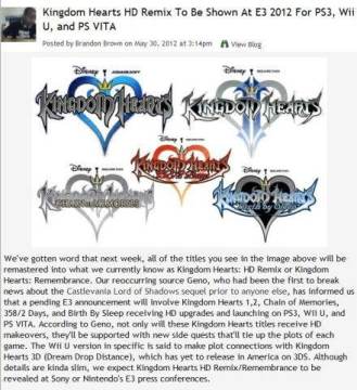 这些王国之心系列游戏作品包括:王国之心1、2、记忆之链、358/2 Days和Birth by Sleep梦中诞生。高清复刻的平台则为PS3,PSV和WIIU。游戏的具体消息可能在E3 2012上公布。
