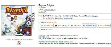 国外购物网站亚马逊不在为何把3ds版雷曼起源的发售日延期到今年11月6日,而在E3之前,育碧公司信誓旦旦地表示该游戏绝对会在6月5日任天堂E3发布会上面世,究竟因何缘故导致这一移植版作品再次延期,我们还不得而知,希望到时育碧公司会给玩家一个解释。