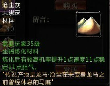 等到了35级的玩家,就可以用比较高级点的沧尘灰来炼化坐骑(战虎啸天)沧尘灰提升1点速度11点胆color=black]气