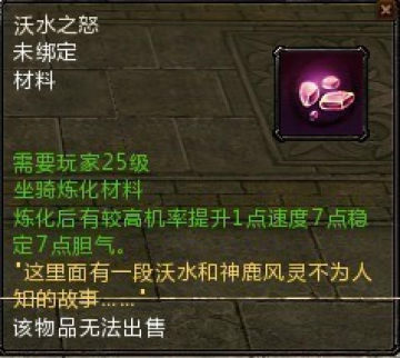 等到玩家到了25级就可以用沃水之怒来炼化坐骑(战马凌云)沃水之怒是提升1点速度7点胆气和7稳定。