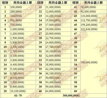 DNF各等级的金币持有上线一览 来源: 飞翔小编 2012/6/17 9:03:57 浏览量:2576 DNF各等级的金币持有上线一览:以后买东西前可以先看看对方的等级,了解对方的金币持有量上限。这样可以减少被骗的几率哦。