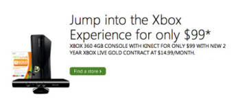 记得在微软曾经在5月份的时候发布过一款十分廉价的99美元Xbox360套装,该套装包含4GB版Xbox360一台、Kinect体感外设一台以及为期两年、每月14.99美元的Xbox Live黄金会员服务。不过可惜的是该套装只通过微软专卖店销售。