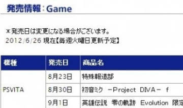 各位轨迹玩家期待的PSV《零之轨迹 进化版》目前曝光了其发售日,根据日本经销商WonderGOO发售表显示,本作的最新发售日为2012年9月1日。不过这个消息却没有得到Falcom公司官方的确认。
