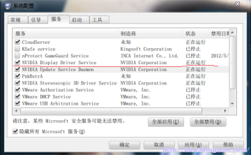 将划红线的服务打开然后重启。或者在服务管理中打开也可(鼠标点我的电脑右键管理->服务和应用程序->服务:NVIDIA Display Display Service右键启动)