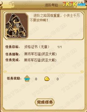 去武圣大殿找黑将军石猛对话,原来通过三个测试获得盖满三个章的资格证书就可以进阶成为大侠哦~不过资格证书是需要用1000伏魔点+10000功夫豆购买的哦。