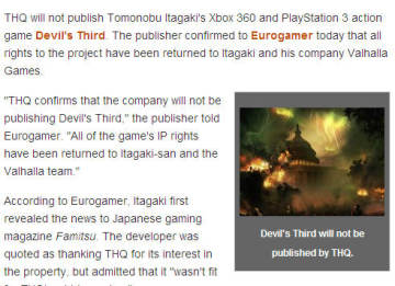根据外媒网站gamespot的报道“忍龙之父”板垣伴信开发的《恶魔三全音》已经进入最后制作阶段,但是还没有找到新的发行商合作。由于财政状况的原因,THQ公司将不会发行恶魔三人组,已经把本游戏的所有版权全部转回板垣伴信和他的制作组,所以要想游戏上市,还要找个实力强劲的开发商才能确保游戏正常发售。