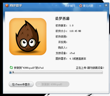 点击按钮【安装】,提示正在安装,安装成功之后,对话框取消,此时你即可在iPad桌面上,查看到《4399造梦西游三之大闹天庭》的图标,进入图标即可展开你的造梦之旅。