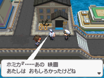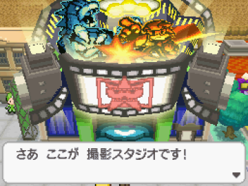 刚打完道馆就有个星探出现了,原来他在看到了主人公的实力后希望主人公能到口袋坞来拍电影,进入口袋坞后被奥米卡的老爹拉去看他拍的电影效果如何,但是发现观众看得都睡着了而且电影最后正义的一方竟然败了……深受挫折的老爹决定还是回去老实当船长,但演电影的志向不会改变。而主人公却是被寄予厚望的新兴演员,第一次的电影会和当红影星也是前作冰道馆主角哈奇库进行合作,和门口的星探对话即可进行拍摄,第一次必须选择电影制作方制定的精灵,拍摄是以战斗形式进行的,剧情这里固定选择一个剧本,需要打倒每关的敌人,同时在过程中还要选择台词,这个剧本中选择的应该是「望むところだ!(求之不得啊!)」