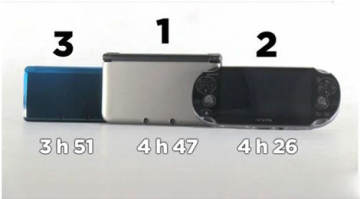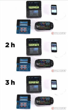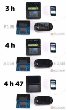 近日国外媒体GAMEKULT对三台次世代掌机PSV、3DS和3DS XL进行了个续航时间进行测试,看哪台掌机支持的时间最久。最后3DS和PSV先后阵亡,而3DS XL以4小时47分获胜,看来3DS的改进型不光是型号大点,电池续航时间也比原来要长。