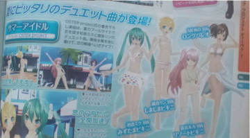 世嘉公司的音乐游戏《初音未来 歌姬计划f》即将上市发售,想必到时又会卷起一片初音未来风,根据最新游戏杂志图消息,本作将有大量的新曲目和新服装供玩家游玩,特别值得一提的是初音未来家族的女性集体泳装,真是萌死了,还有就是晚礼服套装,初音和巡音穿着还是很性感的。