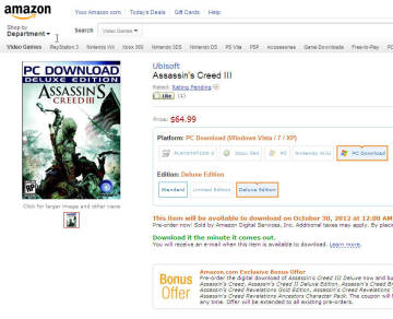 下面是亚马逊《刺客信条3》豪华版优惠说明: