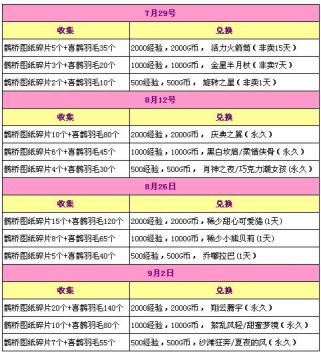 7月29日、8月12日、8月26日、9月2日,来收集鹊桥图纸碎片、喜鹊羽毛,就可以兑换到丰厚的经验、G币、非卖,以及永久期限的好礼哦!