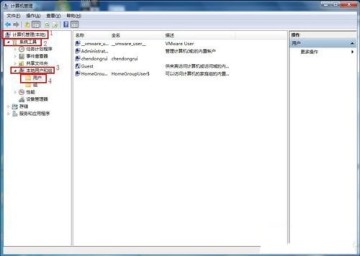 在左侧的控制台树依次展开到“计算机管理(本地)——系统工具——本地用户和组——用户”