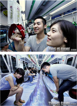 现今游戏厂商的广告宣传真可谓无奇不有,韩国游戏厂商为了宣传其网游《Cyphers》,将广告植入了地铁车厢中,把游戏名称放入地铁的把手,而在地铁车厢的地面则利用冰雕的形式,为乘客展现了一条长长的冰窟悬崖,加之阴影平面,立体感十足,让很多乘客拍手称赞,也为乘客在炎炎烈日中带去清爽引起了媒体和乘客的广泛关注。