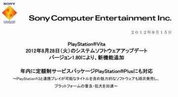 根据索尼PSV官网的最新情报,其将于8月28日放出PSV的1.80固件系统配信,玩家可以到时下载。此次的版本更新将追加对应PS1游戏的支持,Home界面和音乐视频等程序支持按键操作,增加Cross Controler功能可以使用PSV控制PS3游戏操作,视频程序增加快进快退,循环播放,音乐程序支持PS3或iTunes的播放列表等。