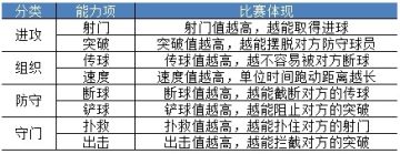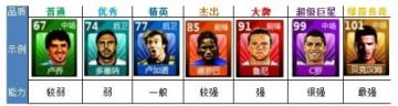 1. 标注1:球员品质。品质共分为7种,品质越高,球员的能力越高。品质按从低到高依次为普通、优秀、精英、杰出、大牌、超级巨星、绿茵传奇。