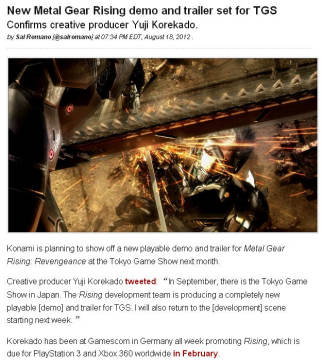 根据外媒gemstsu的报道,Konami公司计划在9月举行的东京电玩展上公布《合金装备崛起:复仇》的新演示动画及宣传片,该作创意制作人在推特中写道: