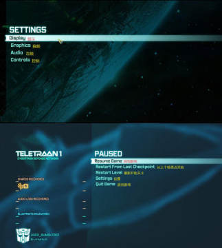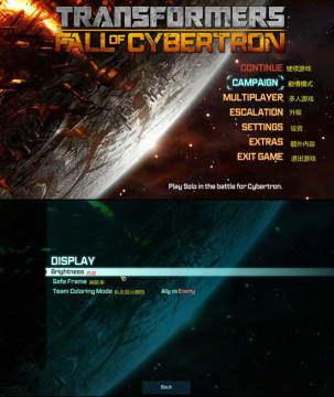 《变形金刚:赛博坦的陨落》中文游戏菜单选项送出 来源: 飞翔小编 2012/8/24 11:01:32 浏览量:858 变形金刚:赛博坦陨落是一款相当好玩的单机游戏,可是英文版本不好上手,今天我们为大家送上中文版的游戏菜单,方便大家更好的进行游戏。变形金刚:赛博坦陨落一款优秀的《变形金刚》游戏已经出现在了我们眼前,儿时的玩具已经跃然屏幕之上,带领它们成为英雄之前,你需要对游戏的菜单选项有所了解,如果你英文不好没关系,我游网为您提供了《变形金刚:赛博坦陨落》游戏菜单选项翻译: