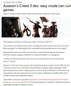 根据外媒VG247的报道,育碧《刺客信条3》的创意总监Alex Hutchinson并不认同游戏的“简单模式”,他认为很多优秀的游戏都被简单模式给毁了。所以《刺客信条3》将不会有简单模式,取而代之的是强化了普通难度的模式。但游戏也像系列外传《兄弟会》和《启示录》一样,能够在流程中选择支线任务,这样能够一定程度上满足追求高难度的玩家。
