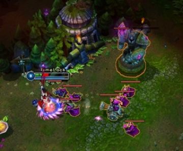 这是对方中路的第一座塔 塔血很厚 伤害很高 塔会优先攻击小兵 所以有小兵顶着的时候就果断打塔耗塔血吧
