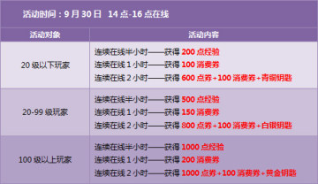 活动当天,我们将从完成14:00-16:00连续在线的玩家中送出10年飞车紫钻、10年QQ会员、10年蓝钻、10年超级QQ、10年黄钻、10年红钻及10年绿钻各一个!