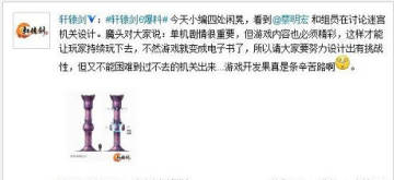 《轩辕剑6》首张游戏场景机关设计图公布 来源: 飞翔小编feichenpan 2012/9/20 14:32:56 浏览量:403 国产经典游戏新作《轩辕剑6》最近公布了首张游戏场景机关设计图,系列制作人蔡明宏表示希望《轩辕剑6》制作人员努力将游戏设计出有挑战性的机关,但是又不能太难,这样不利于玩家通关。此外蔡明宏表示本作的游戏剧情要让玩家感动之外,也希望玩家在游戏过程中玩得开心。 微博截图: 游戏场景机关设计图: