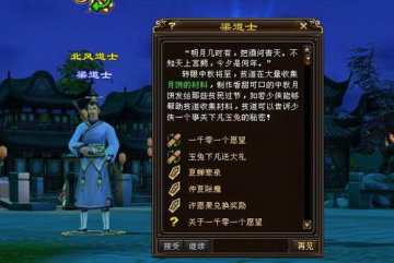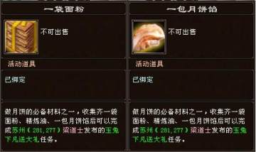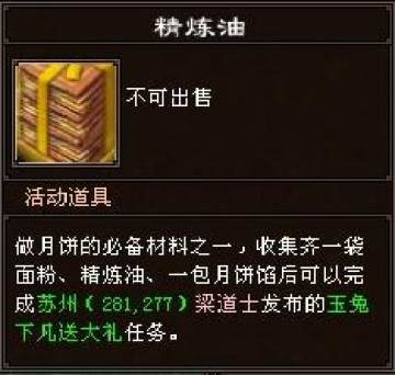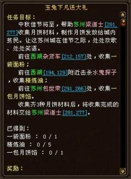 需要帮助他收集做月饼的材料:一袋面粉、精炼油、一包月饼馅。当你收集完成后,前往苏州(281,277)梁道士处提交任务。