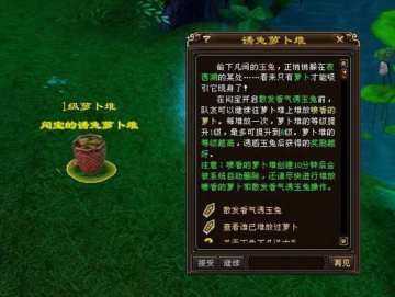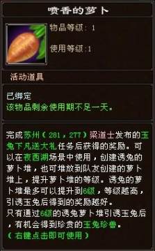 任务完成后除了可获得经验奖励以外,还会获得道具奖励:喷香的萝卜,该道具可用来引诱下凡的玉兔。