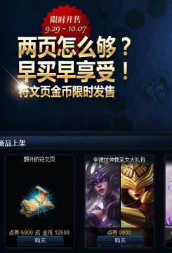 英雄联盟开放金币购买符文页活动限时抢购中 来源: 飞翔小编 2012/9/29 11:59:28 浏览量:20043 英雄联盟体验服很早以前就爆出了用金币购买额外符文页的消息,而后在LOL一周年盛典的活动现场,腾讯公布了将可以用金币买符文页的消息,并同时透露可能会比美服贵一些,因为美服金币获取的难度比国服更大。 今天,英雄联盟不声不响的推出金币购买符文页的限时抢购活动,活动时间为九月二十九日到十月七日的九天时间,售价12600金币。 很明显,腾讯将一个应该是永久的活动变成了一个短期活动,目的不言而喻。