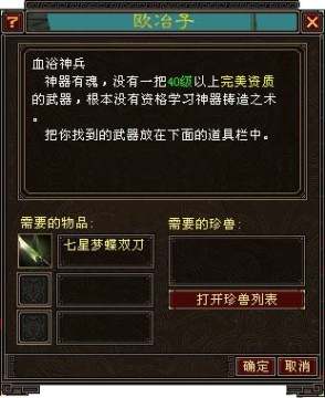 任务领取条件:玩家等级>=40,在苏州城的欧冶子[266,140]处提交一把武器。武器等级不小于40级,但不超过玩家等级,内、外攻资质均为完美。提交武器后,就可领取任务“血浴神兵”。需要注意的是提交武器的等级将与得到神器的等级有关。