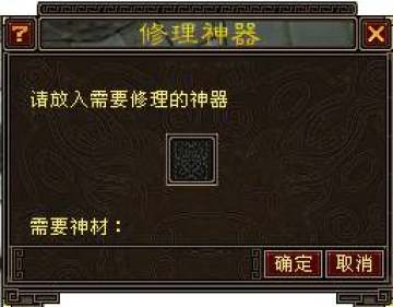 神器不能通过正常途径修理,玩家可在苏州城找铸造功能NPC欧冶子[266,140],打开神器修理界面进行神器修理,修理需要消耗对应等级的新莽神符。