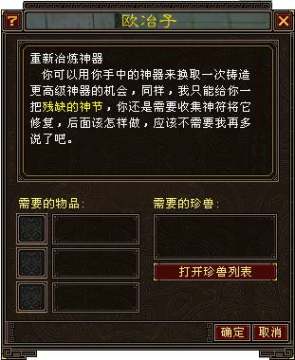 已经持有神器的玩家,也可以通过欧冶子[266,140]升级神器或修理神器。