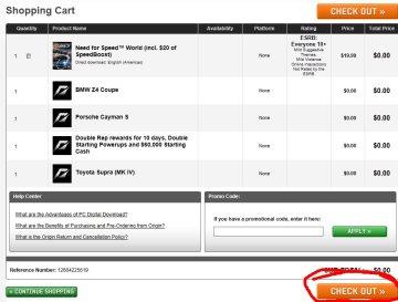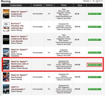 下一步:这时候 就能在 网页中大家可以找到游戏 诸如 极速快感OL 启动包 极品飞车14之类的 。大家选择自己想要的商品然后点 绿色的按钮 ADD TO CRRT