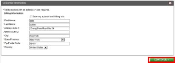 下一步:填写订单地址 , 带*符号的一定都要填写 名字什么的都可以随意的写。地址Address那里写 ZhongShan Road No.54(当然别的地址也可以) City那里 要填写NewYorK State/Province:里也要选择NewYorK , ZIP/Postal Coad 就是邮编了 这里写纽约市的邮编10451 下面国家 当然选择美国 请仔细看图片就可以了。我就不多说了,然后点CONTINUE下一步就可以了。