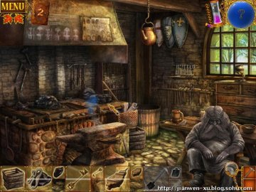 进了门,发现黑史密斯中了魔法在睡觉,提示为他完成锻造匕首。好吧,又开始了寻找工具的人生。其中钥匙在史密斯的手里。顺便别忘了找叶子,一片叶子需要点击这里发现。