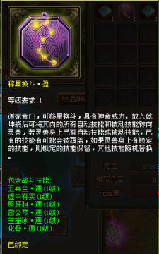 转移时无视技能的锁定情况,所有自动技能与被动技能都被转移,原来灵兽的技能栏变为未冲开的状态,得到的新道具移星换斗•盈为已绑定。