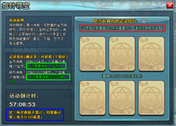 【活动介绍】:活动期间,累计消耗一定数量的金币或银币,即可获得1个宝物记录指针。消耗1个记录指针可以进行一次寻宝,奖励包括能量球、星石、贝箱、怒气贝、幸运星、名望卡等等道具。