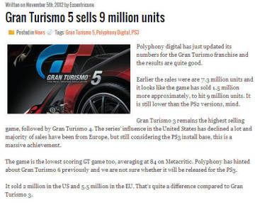 PS3独占游戏《GT赛车5》全球销量已达900万