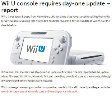 任天堂新主机WiiU即将于11月18日在美国上市发售,更以往的新游戏主机一样,刚上市的WiiU需要更新系统,也就是系统升级,升级之后就能使用游戏社区Miiverse,Wii U Chat聊天,Nintendo TVii视频和网络商店eShop的功能。根据外媒VG247的消息,任天堂为了赶在第一时间让各位领略次世代的游戏性,目前库存的几百万台WiiU都来不及打上这些功能的补丁,只有让玩家自己动手了,相信各位任天堂爱好者通过这小小的锻炼,能增加动手的成就感和更加快的融入到次世代的游戏性中。