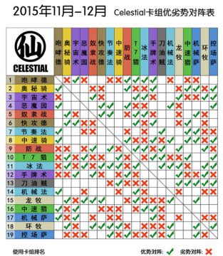 卡组对抗优劣表由Celestial League战队为您带来。卡组间的优劣势是相对的,表中的内容仅供参考。