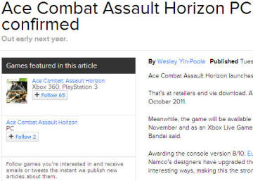 根据外媒eurogamer的情报,南梦宫经典空战游戏《皇牌空战》系列新作《皇牌空战 地平线》将登入PC平台,届时会同时发售该作的数字下载版和零售版,预定于2013年春季发售。《皇牌空战 地平线》曾经于2011年10月登陆PS3和Xbox 360平台,不过该作的媒体评价不高,Gamespot给出5.5/10评价,IGN 给出7.5/10评价,1UP给出D+评价,MC媒体平均分77/100,看来该作PC版也许是个雷,各位玩家可以先在主机平台试玩下,看看是否符合自己口味。