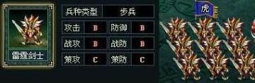 咋一看,雷霆剑士的外观很像机器人有木有?观其属性,普通战法攻防能力都是B,稀松平常的属性为何大家会喜欢呢?原因就在于雷霆剑士超高的暴击率,作为步兵中最擅长暴击的兵种,雷霆剑士在战斗中能打出极高的输出。