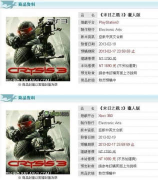 《孤岛危机3》官方中文版曝光 明年2月19日发售 来源: 飞翔小编feichenpan 2012/12/19 9:38:35 浏览量:283 现今各个游戏厂商的游戏中文化是越来越给力了,继育碧《刺客信条3》官方中文版和SE《古墓丽影9》宣布将有中文版游戏后,EA公司也在近日曝光了最强画面游戏《孤岛危机3》的官方中文版游戏,根据台湾巴哈姆特商城的情报确认,该作亚洲中英文合版将于2013年2月19日发售,登入XBOX360和PS3平台,PC版未知。本作继古墓丽影中文化后,孤岛危机系列中文化首次登陆家用机平台。