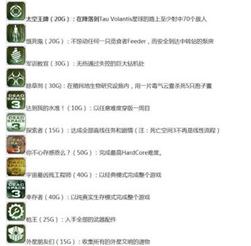 EA公司的恐怖大作《死亡空间3》将于2013年2月5日发售,正式登入PC,PS3和XBOX360三大游戏平台,近期有外媒曝光了该作XBOX360版的成就列表,管中窥豹,可以看出本作的一些游戏内容,当然PS3版玩家也同样适用,只要吧成就脑补成奖杯即可。下面就给大家分享下《死亡空间3》全成就的获取方法,希望大家喜欢。