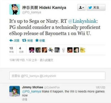 《猎天使魔女》是2009年推出的一款经典动作游戏,其XBOX 360版获得了Fami通满分评价,在玩家群体中亦有非常好的口碑。其续作已经确认登陆WiiU平台,不过玩家们似乎还不感到满足,近日某位玩家在推特上询问神谷他们是否会为WiiU eShop开发下载版的《猎天使魔女》,以确保玩家们不会错过这款经典作品,对此神谷回应道:“这要看世嘉或任天堂。”