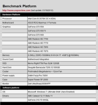 测试平台使用了超频至4.0GHz的Core i5-3570K处理器,搭配了双通道8GB(4GB*2)内存,参与测试显卡有GTX 650、GTX 650 Ti、GTX660以及HD 7750、HD 7770、HD 7850、HD 7870,共计七款。测试时,NVIDIA显卡使用的是GeForce 310.70 WHQL驱动,而AMD显卡则使用Catalyst 12.11 Beta 11驱动。