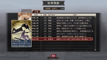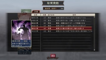 选择使用秘策的画面。该势力能使用的秘策和谁持有这些秘策一目了然。手下的军师越来越多的话,从秘策角度考虑对敌人的攻略也会方便很多。
