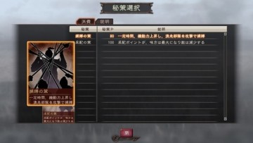 “捕缚之策”不光使我方的速度上升,溃走状态的武将会被立即捕获。在阻止敌军强力武将再出击和积极俘虏敌军武将解决我军人才不足时都很有用。