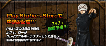 《海贼无双2》PS3试玩版3月7日开始配信 来源: 飞翔小编feichenpan 2013/3/4 15:42:46 浏览量:263 NBGI动漫改编大作《海贼无双2》将于2013年3月20日发售,登入PS3主机和PSV掌机,在游戏发售前,官方宣布将在PSN网络平台提供该作PS3体验版游戏,预定于3月7日开始配信,玩家将在空岛的舞台上大显身手,各位喜欢海贼王的玩家千万不要错过了。《海贼无双2》是由无双系列工作室W-Force开发,NBGI公司代理发行的动漫游戏,在本作中新增了数名可操作角色,包括白胡子海贼团不死鸟,王下七武海暴君熊,莫利亚,海军三大将,死亡外科医生罗等,他们将在游戏中首次参战登场,相信会有不错的表现。