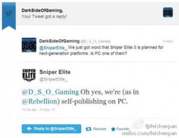 射击游戏界占有一席之地的《狙击精英》系列新作正在制作中,发行商505 Games宣布《狙击精英3》将于2014年登入PS3,XBOX360和次世代主机平台,不过PC版消息只字未提。近日有媒体在推特上追问游戏制作商Rebellion关于新作PC版的信息,Rebellion官方明确回答道《狙击精英3》PC版存在,将由其亲自发行。